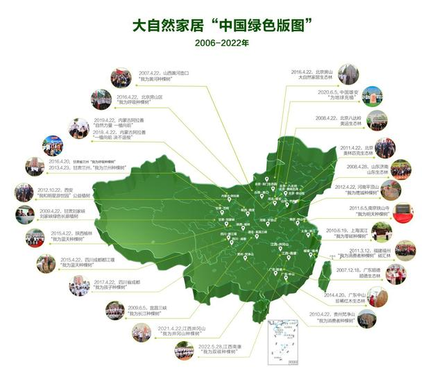 除此之外,為提高社會公眾造林綠化、改善生態(tài)環(huán)境的意識,自2006年起積極推進(jìn)“中國綠色版圖工程”,大自然家居相繼開展了16年公益植樹活動。據(jù)相關(guān)數(shù)據(jù)統(tǒng)計(jì),截至 2022年 5 月,在國內(nèi)外 19 個(gè)地區(qū)種植了 27 片生態(tài)林,公益植樹超 100萬棵。與此同時(shí),大自然家居攜手澳門紅十字會開展十年公益計(jì)劃、“中國綠色搖籃工程”公益助學(xué)等活動,以切身行動投身公益,為用戶打造健康、環(huán)保的生活方式。