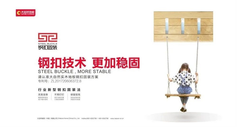 大自然地板歷經(jīng)29載歲月沉淀,在健康家居生活探索屢獲成就,已成為千萬(wàn)家庭的口碑之選。歷年來(lái),大自然地板堅(jiān)持健康環(huán)保的主旋律和產(chǎn)品的創(chuàng)新研發(fā)。歷時(shí)3年潛心研發(fā),大自然地板研發(fā)團(tuán)隊(duì)終于取得重要突破成果 ——“鋼扣固裝方案”,通過(guò)特制的合金材質(zhì)鋼扣,與地板底部精心規(guī)劃的槽口緊密扣合,利用鋼扣弧形結(jié)構(gòu)的預(yù)應(yīng)力,使地板拼接保持在一個(gè)穩(wěn)定的關(guān)聯(lián)狀態(tài),科學(xué)地控制地板干縮濕脹,解決了實(shí)木地板的起拱和起縫問(wèn)題,地暖和非地暖環(huán)境都適用,給家居生活帶來(lái)穩(wěn)穩(wěn)的保障。正是對(duì)地板的持續(xù)創(chuàng)新,大自然地板榮獲世界市場(chǎng)調(diào)查機(jī)構(gòu)歐睿國(guó)際認(rèn)證的連續(xù)四年全國(guó)實(shí)木地板銷(xiāo)量第一的稱(chēng)號(hào)? ,得到消費(fèi)者的認(rèn)可。??